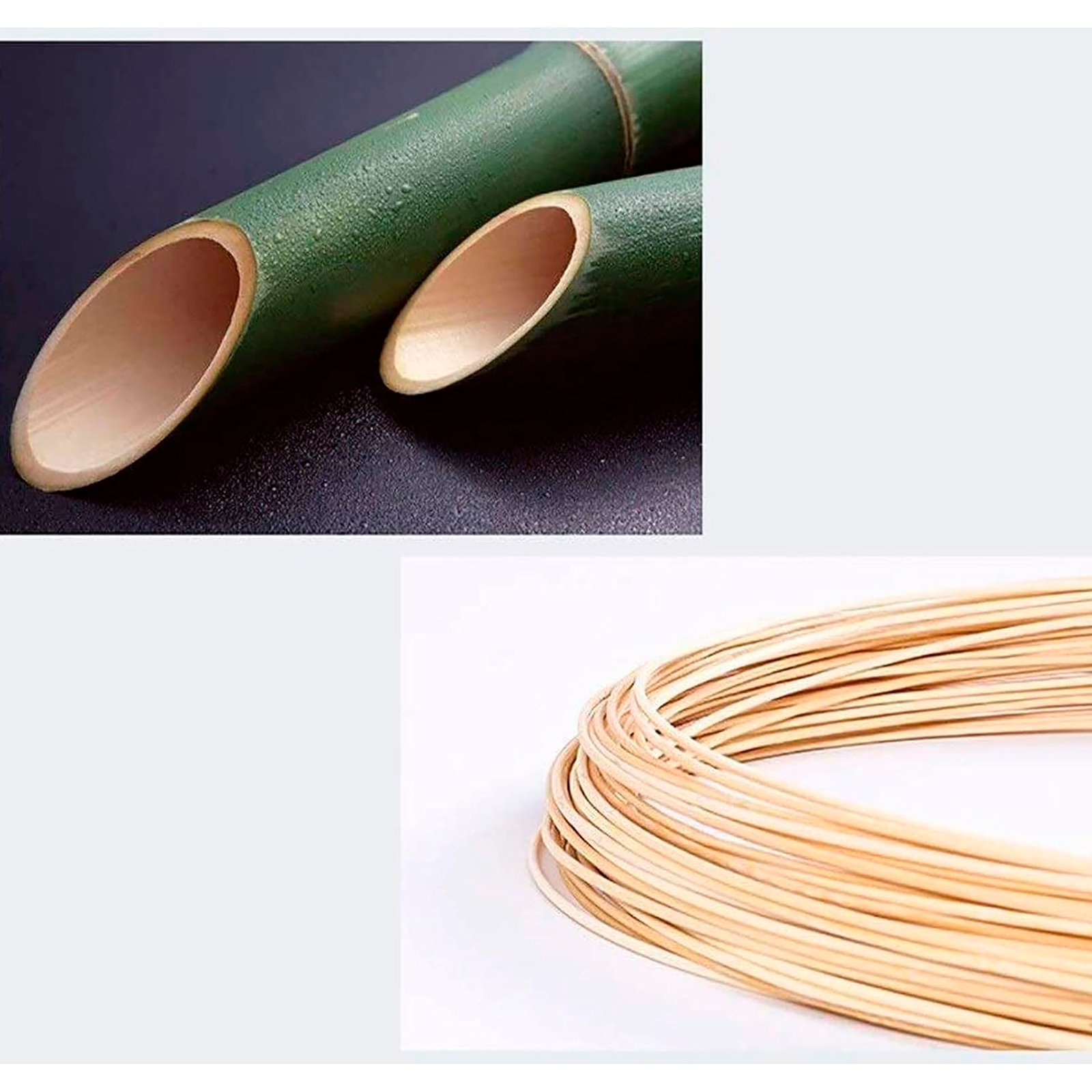 Bambú natural + cordones y herrajes metálicos/plásticos.