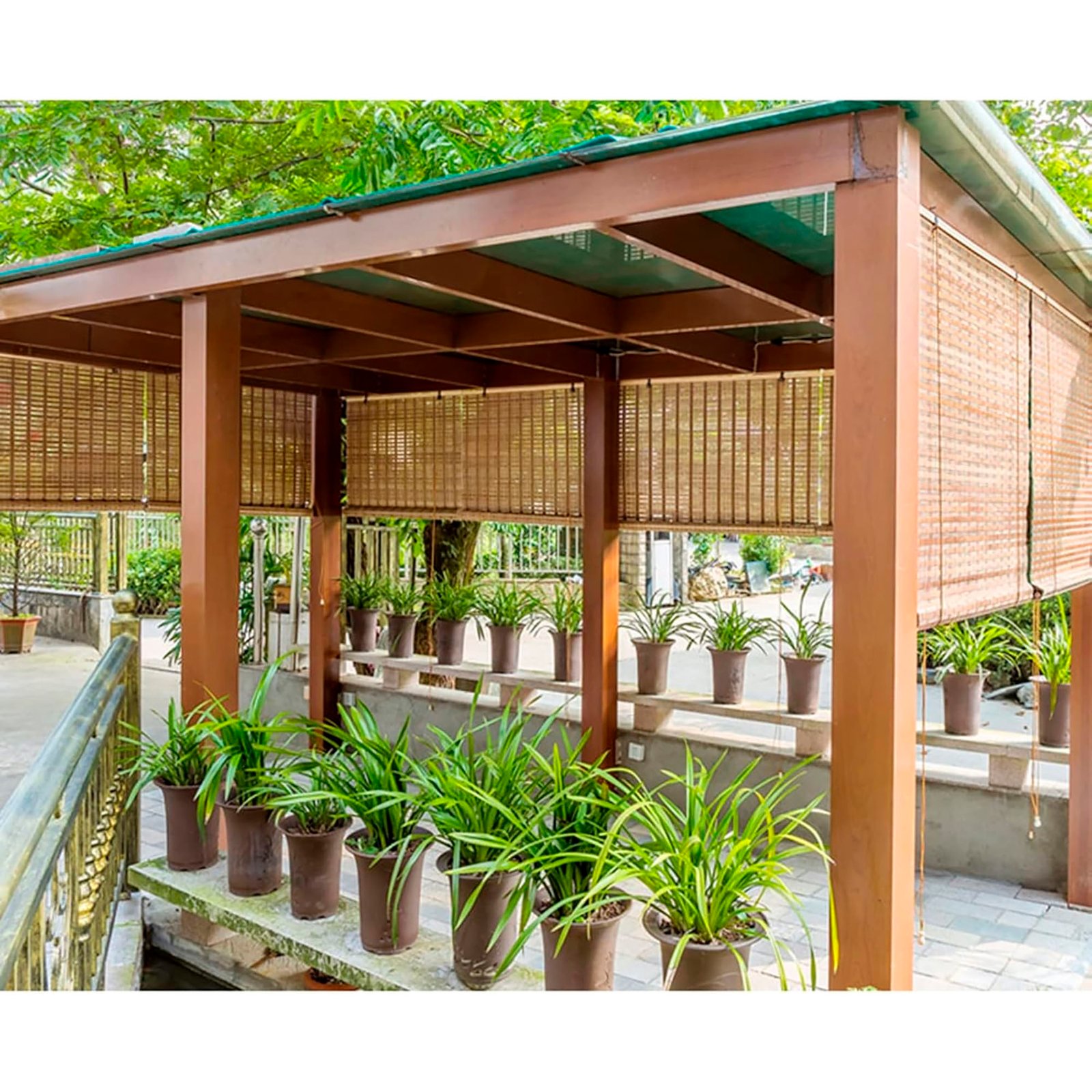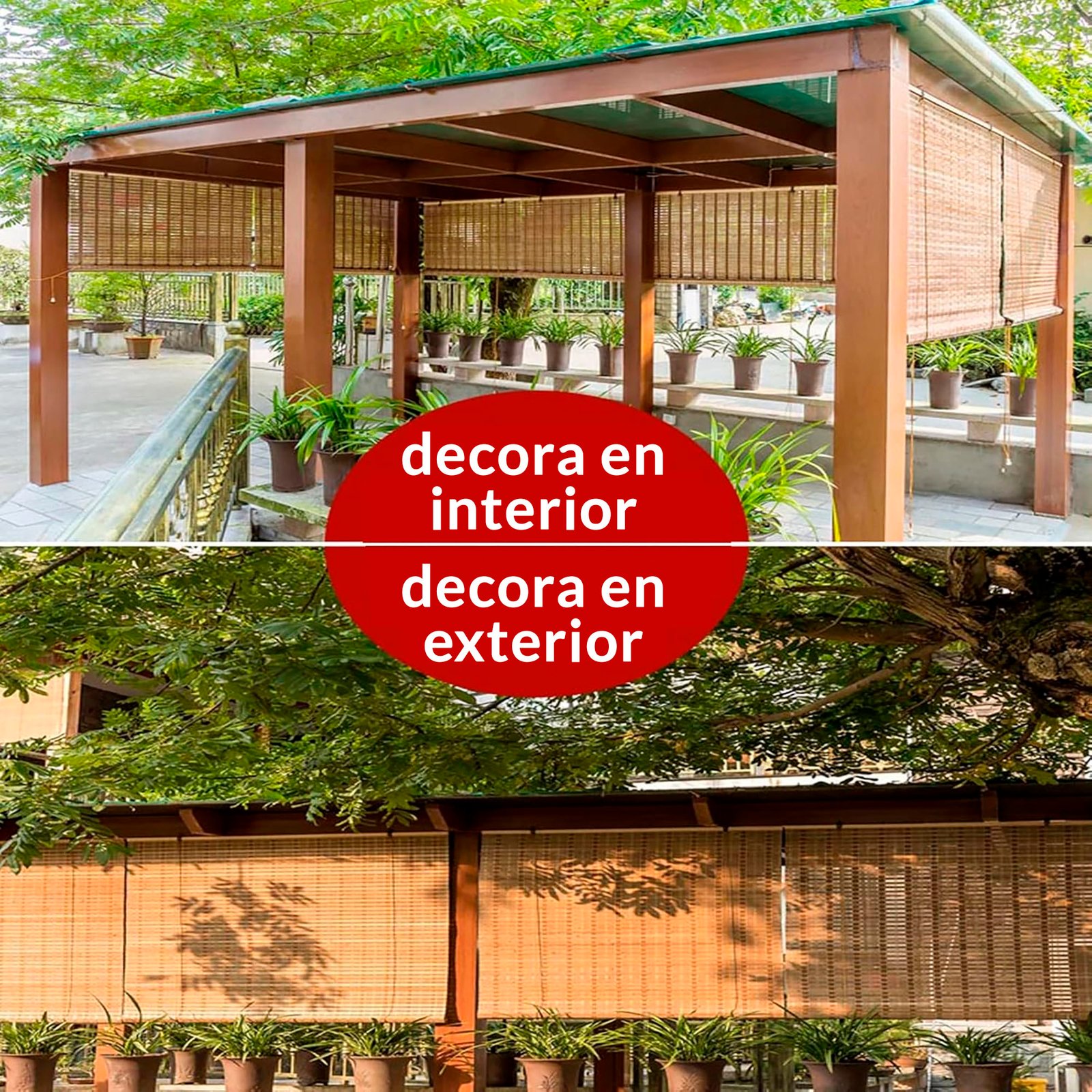 • Material: Tiras de bambú natural / estructura en madera ligera y cordones de elevación.