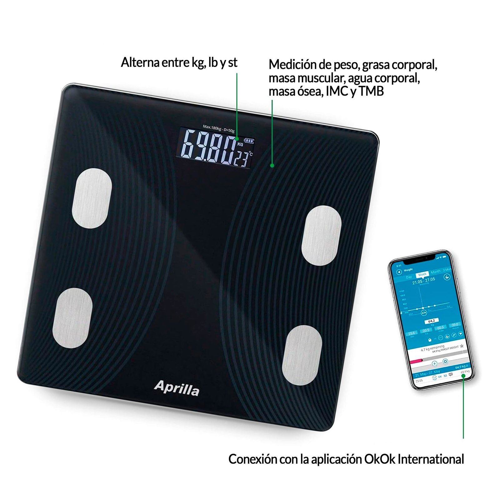 • Análisis corporal completo: peso, IMC, grasa, agua, músculo, hueso y más.
