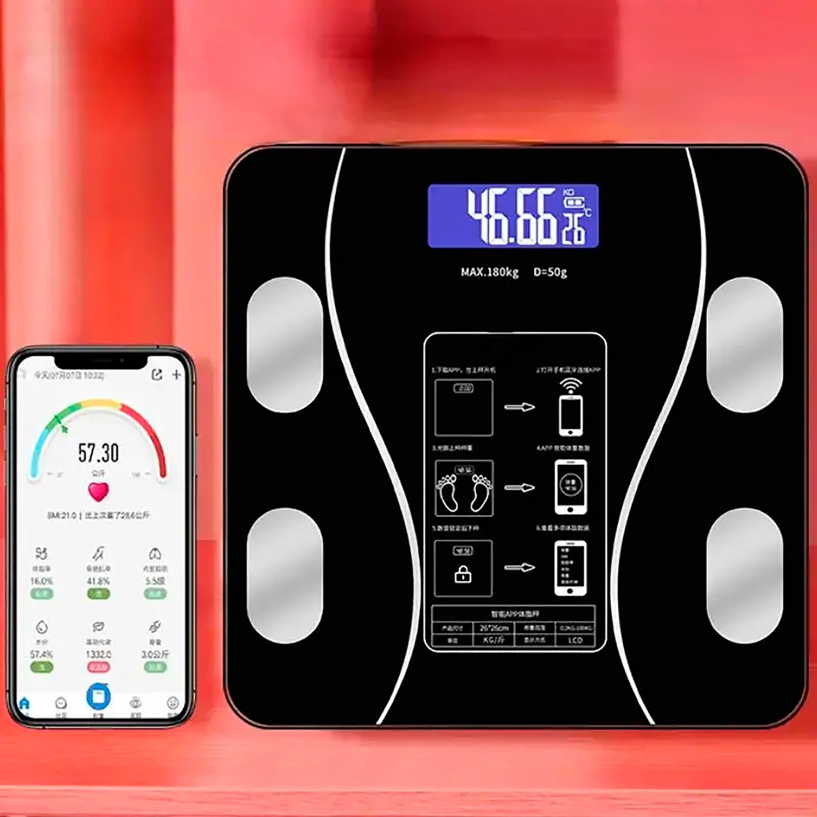 Báscula de baño inteligente Bluetooth 180kg. Alta precisión con IMC, grasa, agua y músculo. Pantalla LCD, auto-off y diseño elegante.