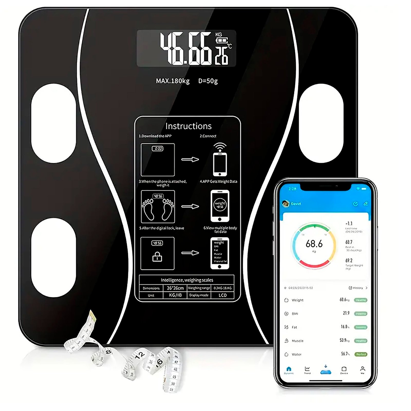 Controla tu salud con precisión profesional. Esta báscula inteligente mide peso, IMC, grasa, agua y músculo con conexión Bluetooth y app móvil, todo en un diseño elegante y seguro.